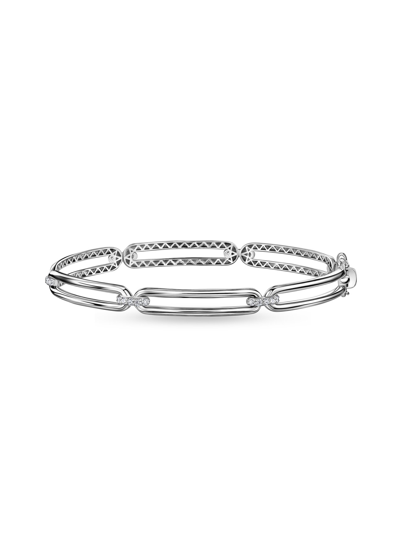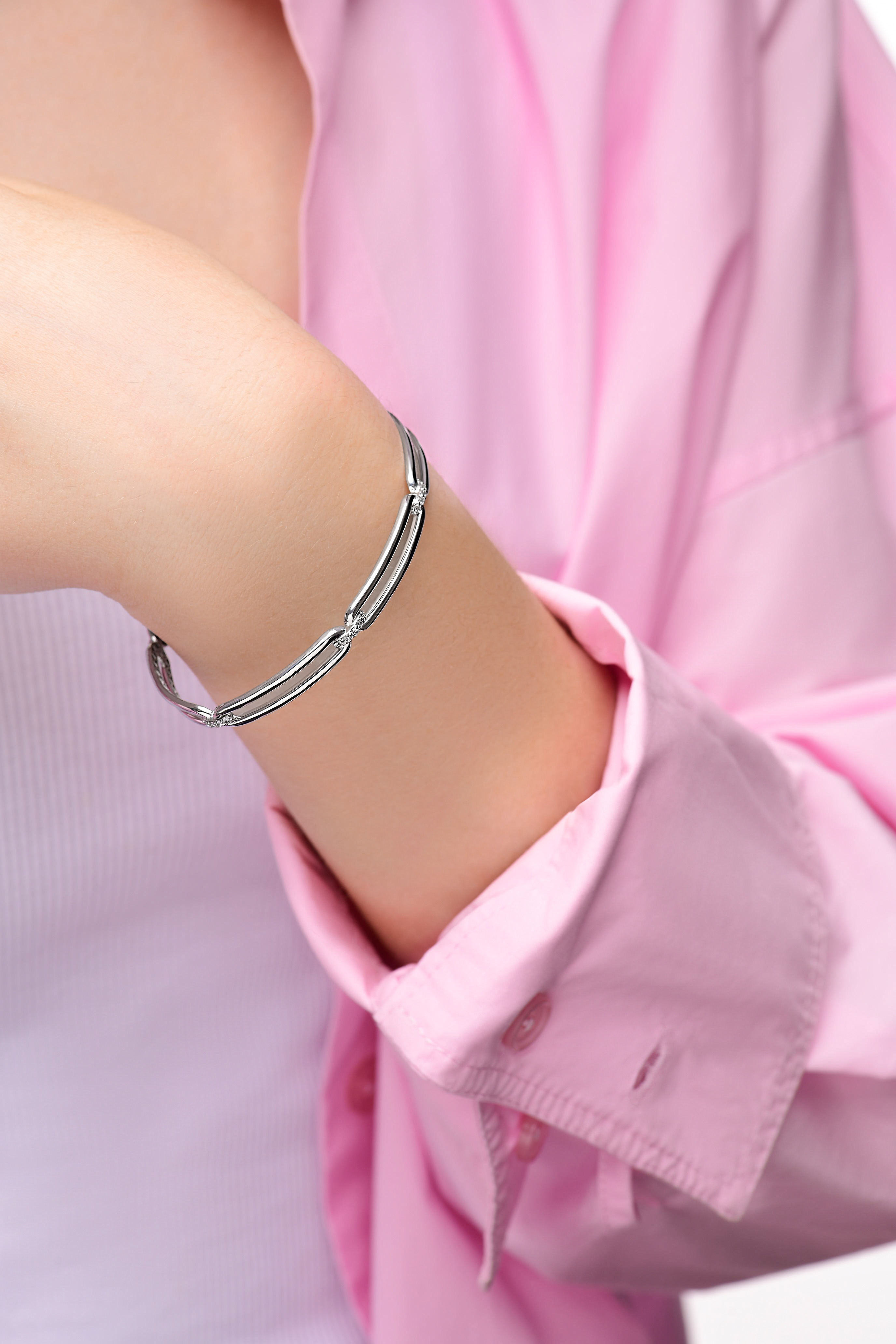 Геометрия власти в твоих руках! ✨ Этот изысканный жесткий браслет с крупными удлиненными звеньями и россыпью бриллиантов – твой пропуск в мир высокого стиля. Полированная серебристая поверхность с треугольным рельефом на внутренней стороне создает невероятный визуальный эффект при движении. Носи его на важную деловую встречу, чтобы подчеркнуть свой статус, или на вечеринку, где этот браслет станет центром внимания. В каждом его блике – частичка твоей силы и уверенности, которая не останется незамеченной!