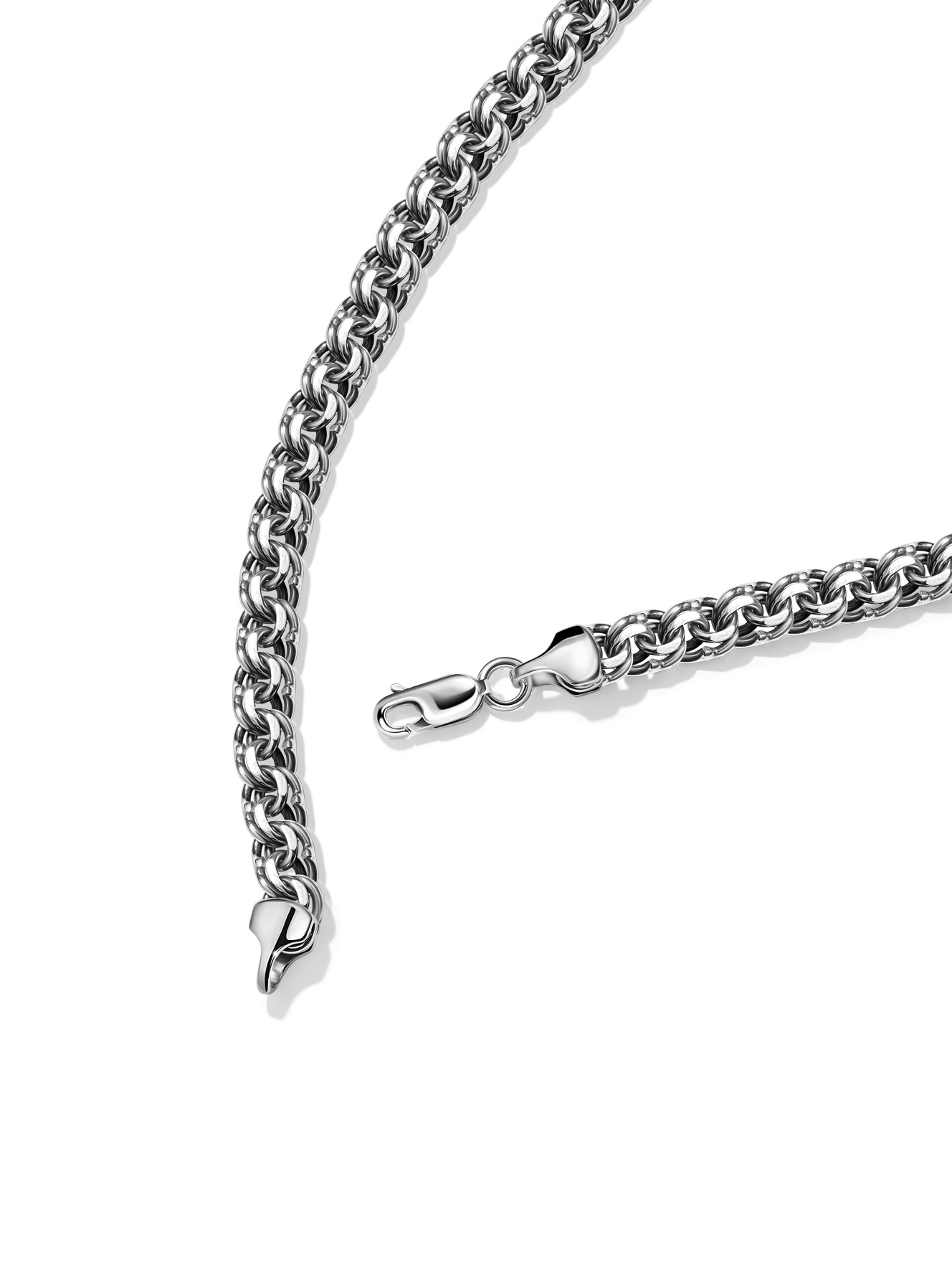Это не просто цепь – это идеальный баланс между элегантностью и силой! "Бисмарк" с двухцветным плетением серебра и черного металла станет твоим самым универсальным украшением на каждый день. Уникальное переплетение звеньев создает завораживающую игру оттенков и текстур, которая привлекает взгляды даже в приглушенном свете. Носи с кожаной курткой для брутального образа или с белой рубашкой для стильного акцента на деловой встрече. В отличие от обычных цепей, "Бисмарк" выдержит испытание временем и останется актуальным, сколько бы сезонов ни сменилось. Пока другие просто носят украшения, ты рассказываешь свою историю!