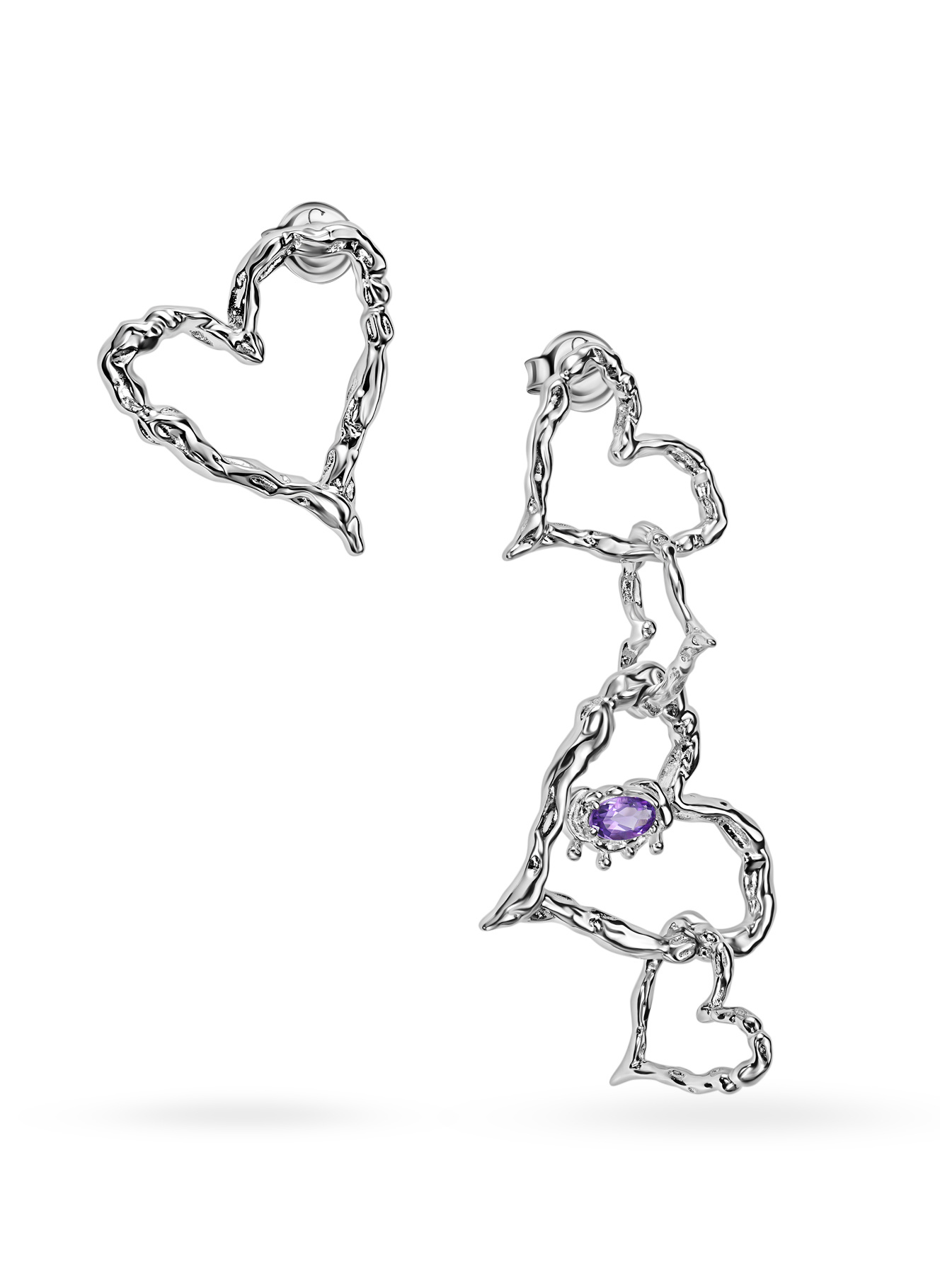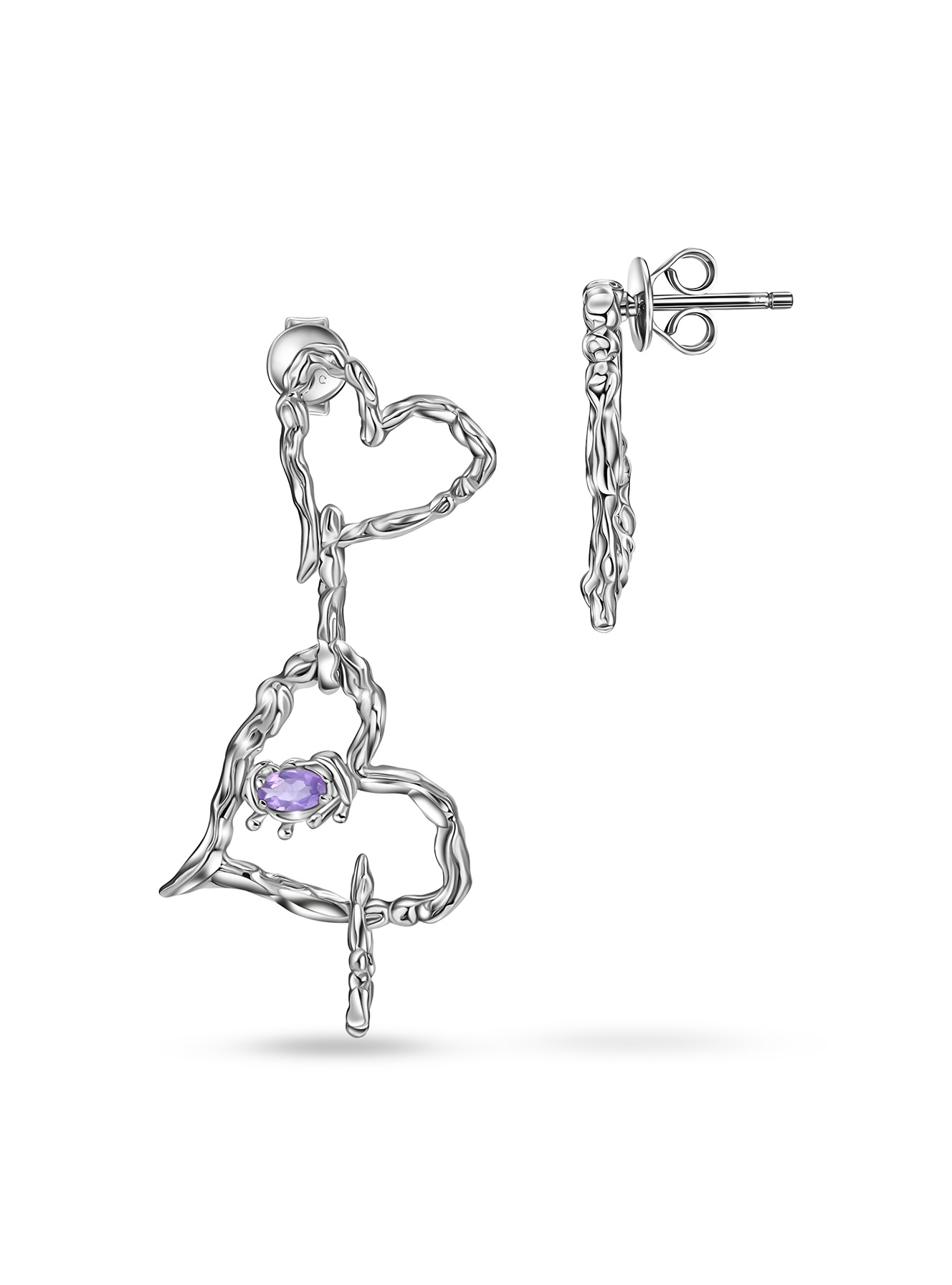 Серьги ассиметричные сердца с аметистом