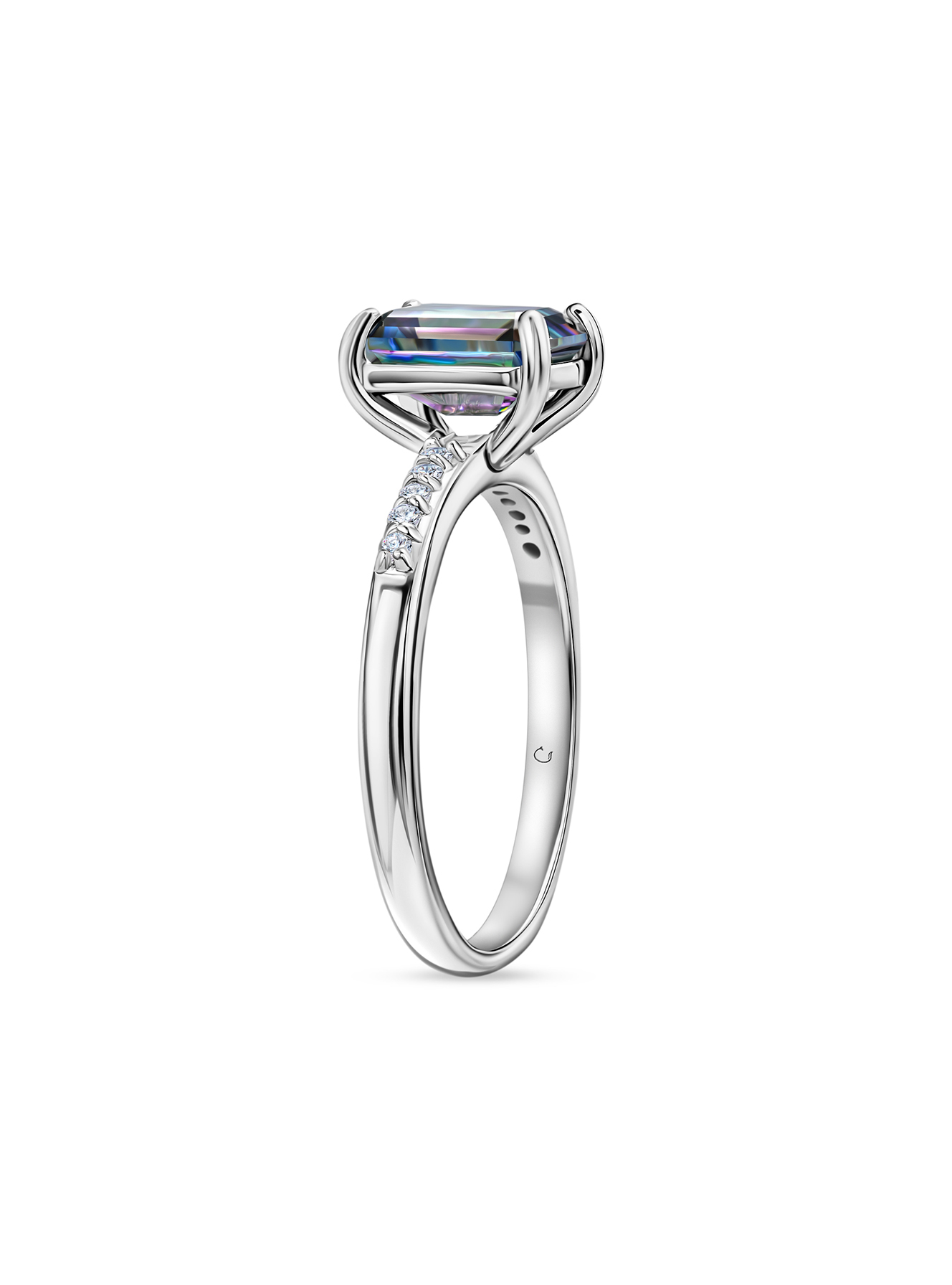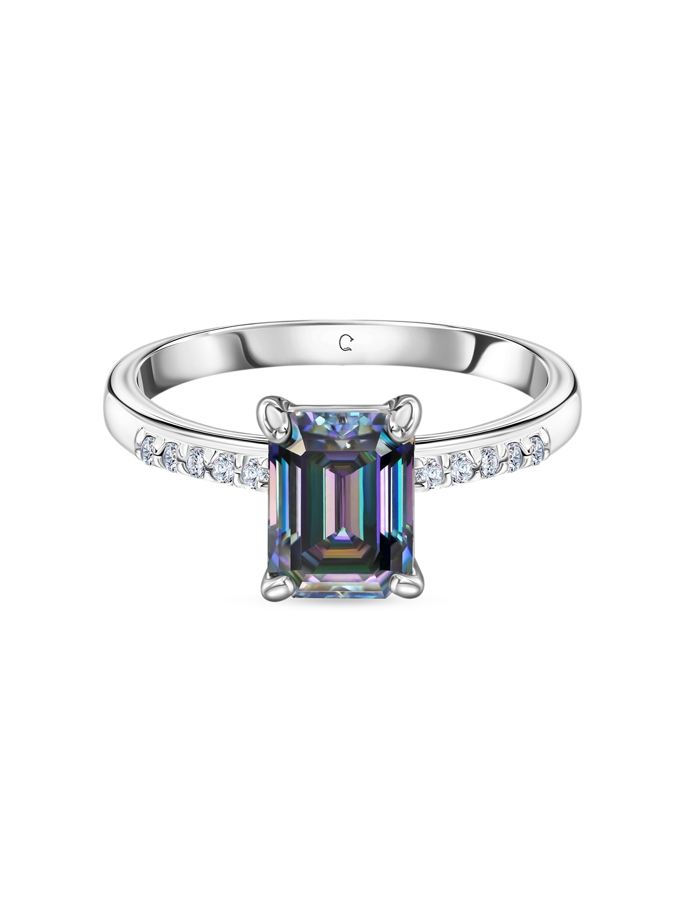 Благородный муассанитовый мистик в серебряном обрамлении бриллиантов создаст твою историю успеха! ✨ Изумрудная огранка камня завораживает переливами радужных оттенков и притягивает взгляды, словно магнит. Прочная четырехзубцовая оправа надежно защищает твое сокровище, а дорожка из бриллиантов на шинке добавляет роскоши без излишеств. Надень его на собеседование или важную презентацию – и твоя уверенность станет твоим главным оружием. Это не просто кольцо – это твое тайное преимущество в мире, где первое впечатление решает всё! В каждом его блике – твоя сила, твой характер и твоя решительность!